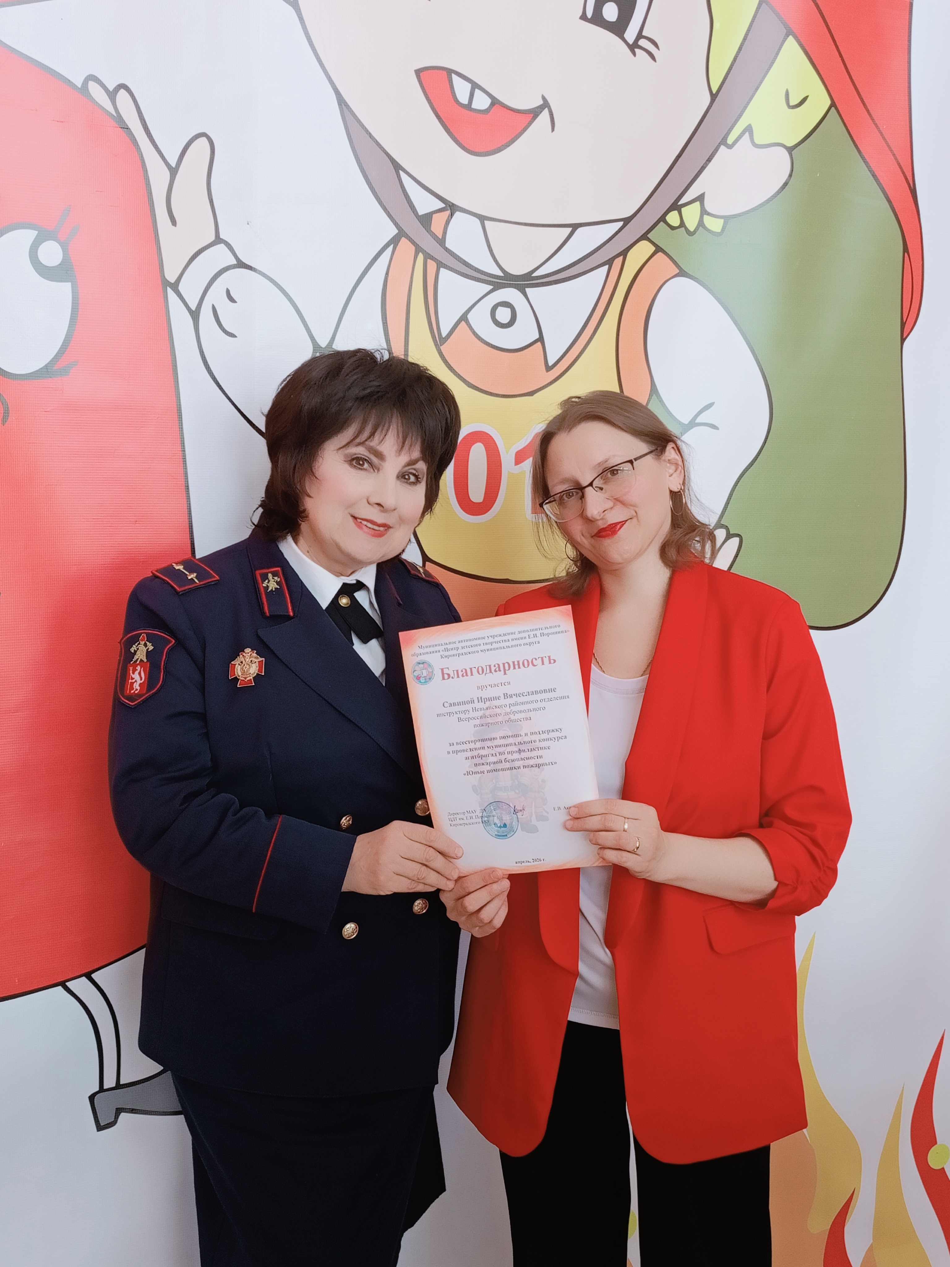 Руководство муниципального автономного учреждения дополнительного образования "Центр детского творчества им. Е. И. Порошина" Кировградского муниципального округа выразило БЛАГОДАРНОСТЬ председателю совета Невьянского районного отделения Всероссийского добровольного пожарного общества ДЕДЮХИНОЙ НАТАЛИИ МИХАЙЛОВНЕ и инструктору по оргмассовой работе НРО ВДПО САВИНОЙ ИРИНЕ ВЯЧЕСЛАВОВНЕ за многолетнее плодотворное сотрудничество, помощь в организации и проведении мероприятий по пропаганде пожарной безопасности среди подрастающего поколения.