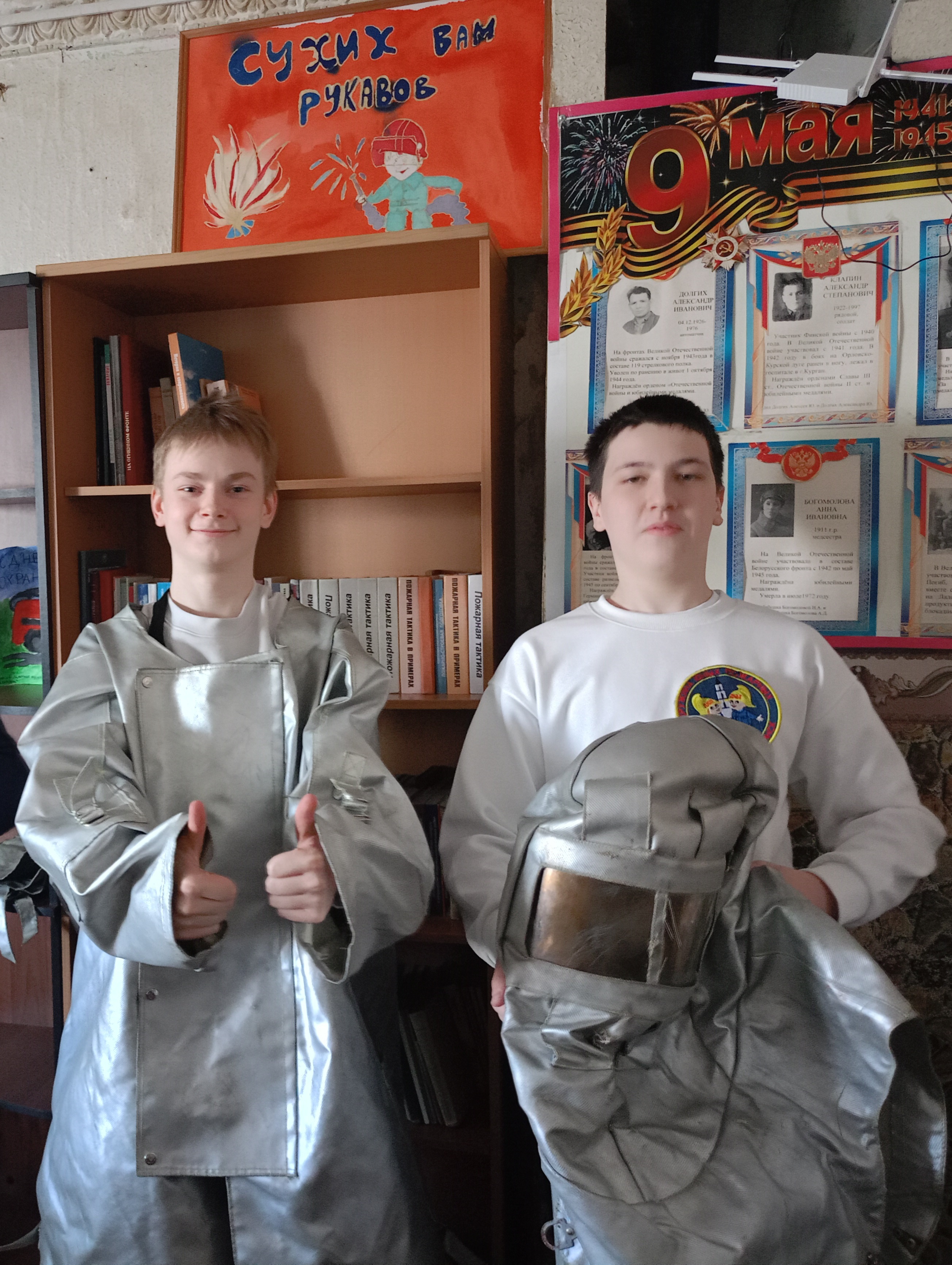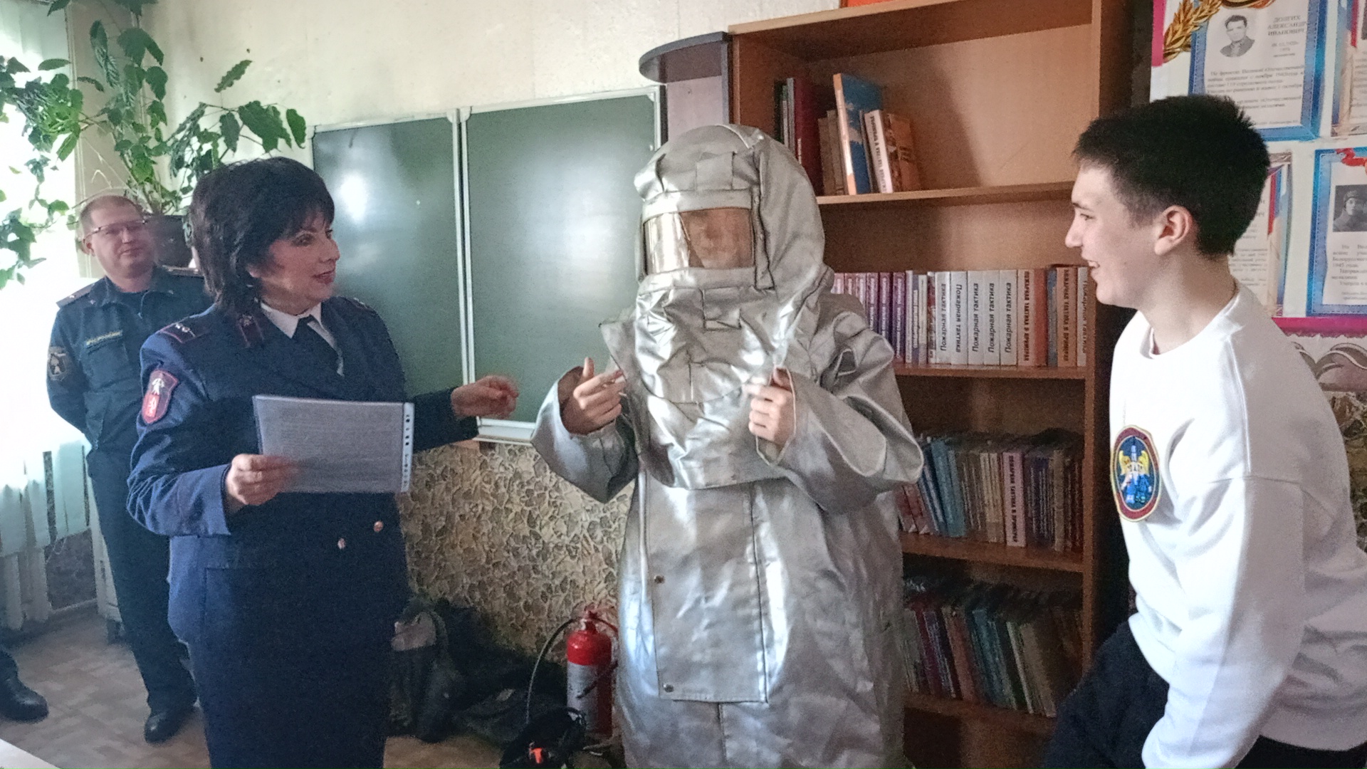 Смельчаки изъявляли желание примерить теплоотражательный костюм. ТОК-200 — это специальная защитная одежда для пожарных, обеспечивающая защиту от интенсивного теплового излучения (до 200 °C), открытого пламени, контакта с горячими поверхностями, а также воды, ветра и влаги при аварийно-спасательных работах. К удивлению организаторов, ребята с заданием справились успешно.