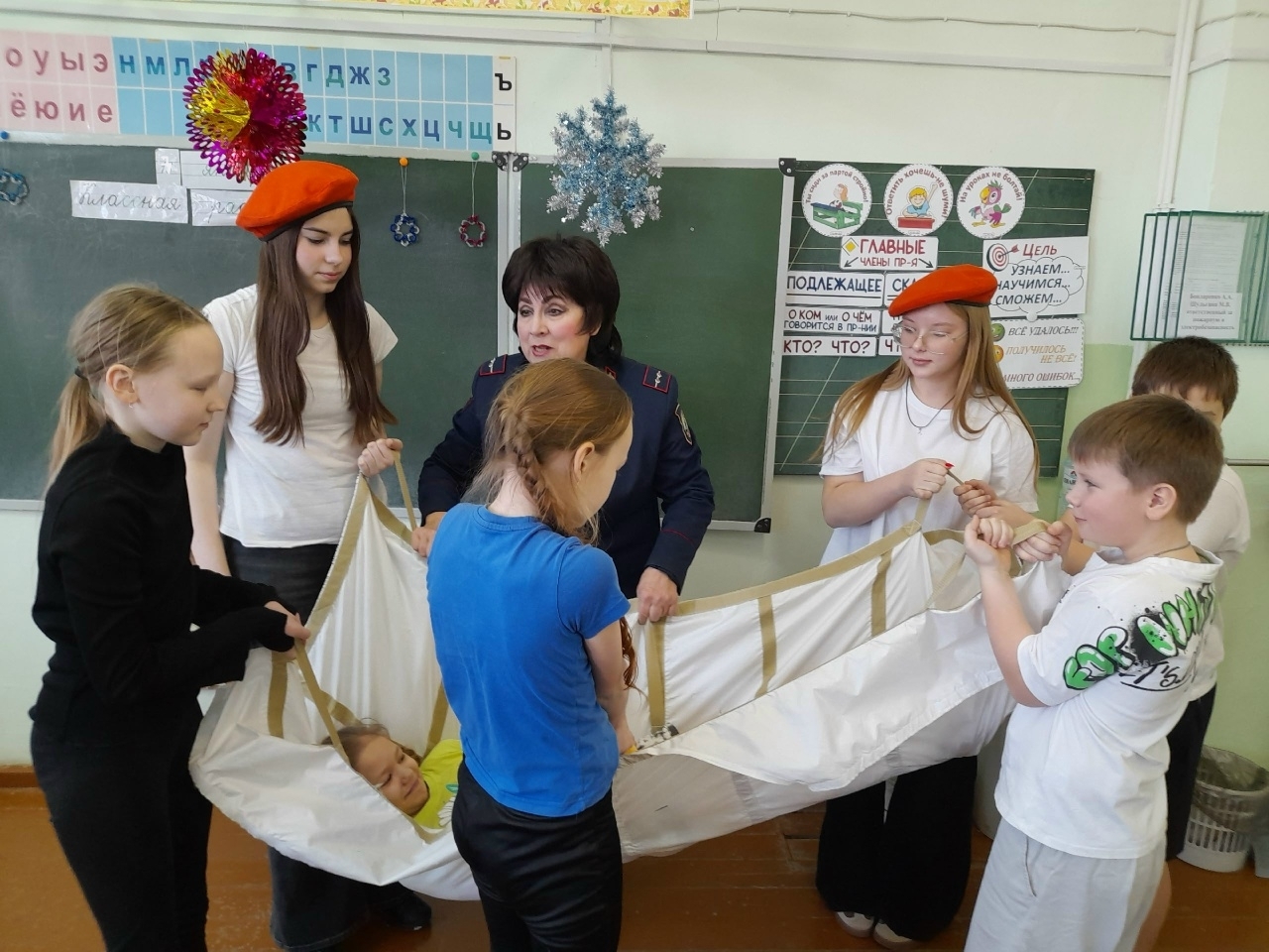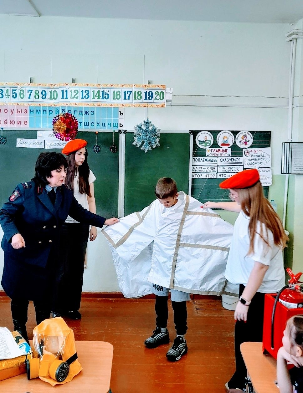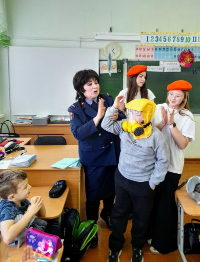 Чаще всего причиной гибели людей в огне является отравление продуктами горения. Как правило, едкий дым быстро проникает в дыхательные органы человека, поэтому так важна своевременная эвакуация людей из охваченных огнем зданий, помещений. В подвижных играх, устроенных прямо в классе, в целях ознакомления учащимся были представлены средства индивидуальной защиты органов дыхания (СИЗОД, ГДЗК), которые используются для эвакуации из очага возгорания. Мягкие бескаркасные носилки «ШАНС» из огнеупорной ткани, предназначенные для выноса пострадавших в безопасную зону при пожарах, ребятишки с огромным удовольствием попытались применить по назначению.