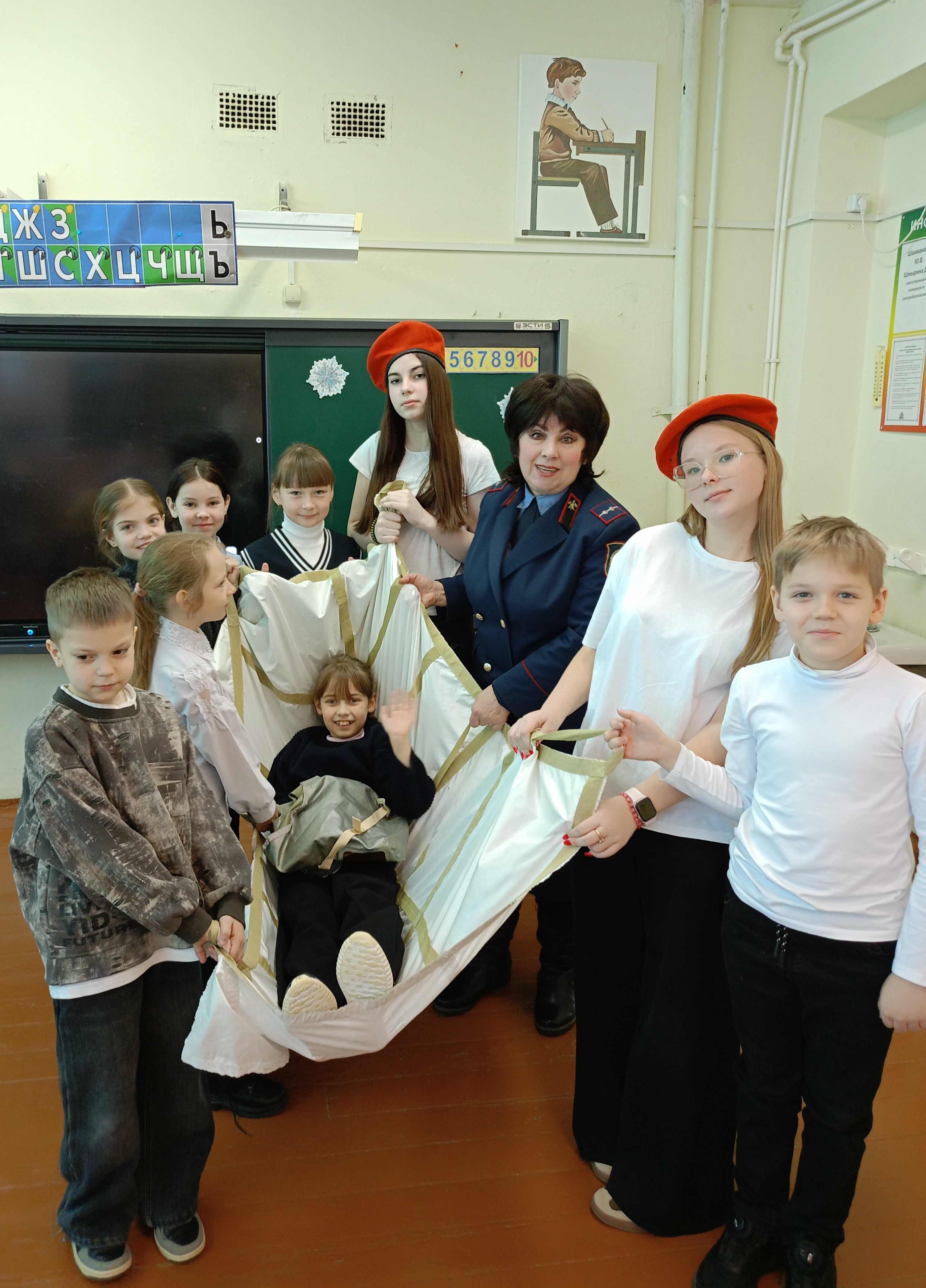 Была сымитирована эвакуация «пострадавшего» на мягких бескаркасных носилках «Шанс» из огнестойкой ткани, которые так же могут использоваться в качестве огнезащитной накидки, предотвращающей возгорание одежды и защиты тела человека от открытого пламени, повышенных температур, теплового излучения при самостоятельной эвакуации в условиях пожара.